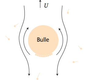 Représentation schématique du rôle joué par les tensioactifs sur l'ascension de la bulle.